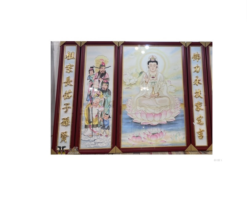 手繪全彩鑲金邊-觀音綢布聯-立體金字